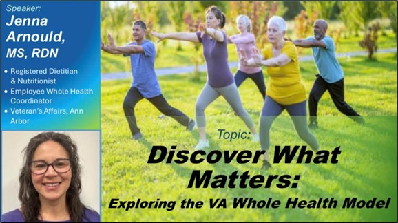 Our speaker is Jenna Arnould, MS, RDN, the Employee Whole Health Coordinator at Veteran’s Affairs in Ann Arbor. Here is the agenda for the event: